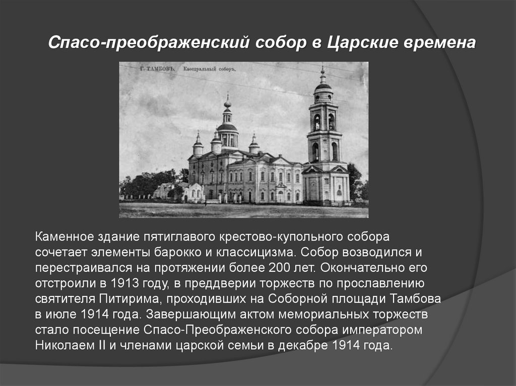 Cпасо-преображенский собор в Царские временаКаменное здание пятиглавого крестово-купольного собора