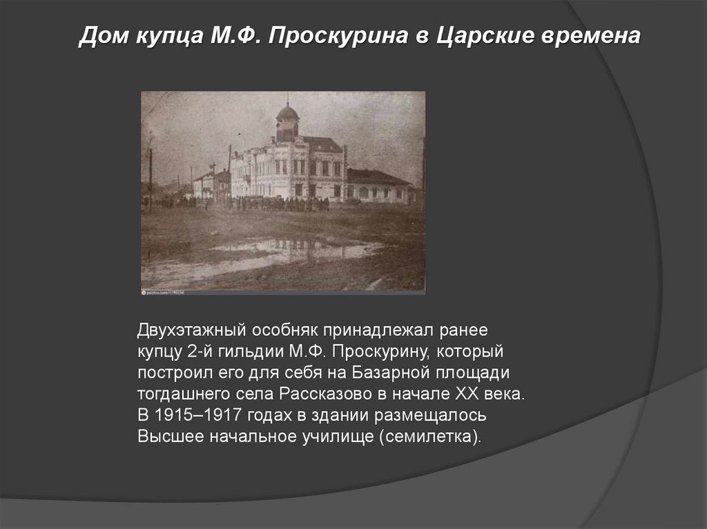 Дом купца М.Ф. Проскурина в Царские временаДвухэтажный особняк принадлежал ранее