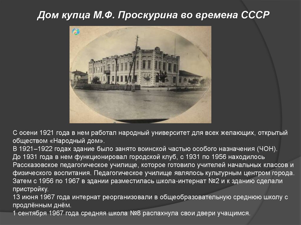 Дом купца М.Ф. Проскурина во времена СССРС осени 1921 года в нем работал народный университет для всех желающих, открытый