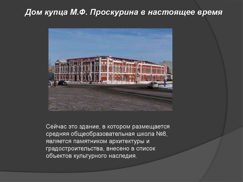 Дом купца М.Ф. Проскурина в настоящее времяСейчас это здание, в котором размещается