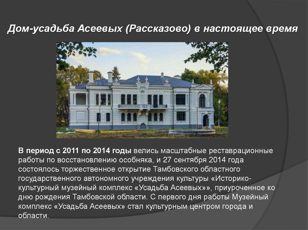 Дом-усадьба Асеевых (Рассказово) в настоящее времяВ период с 2011 по 2014 годы велись масштабные реставрационные