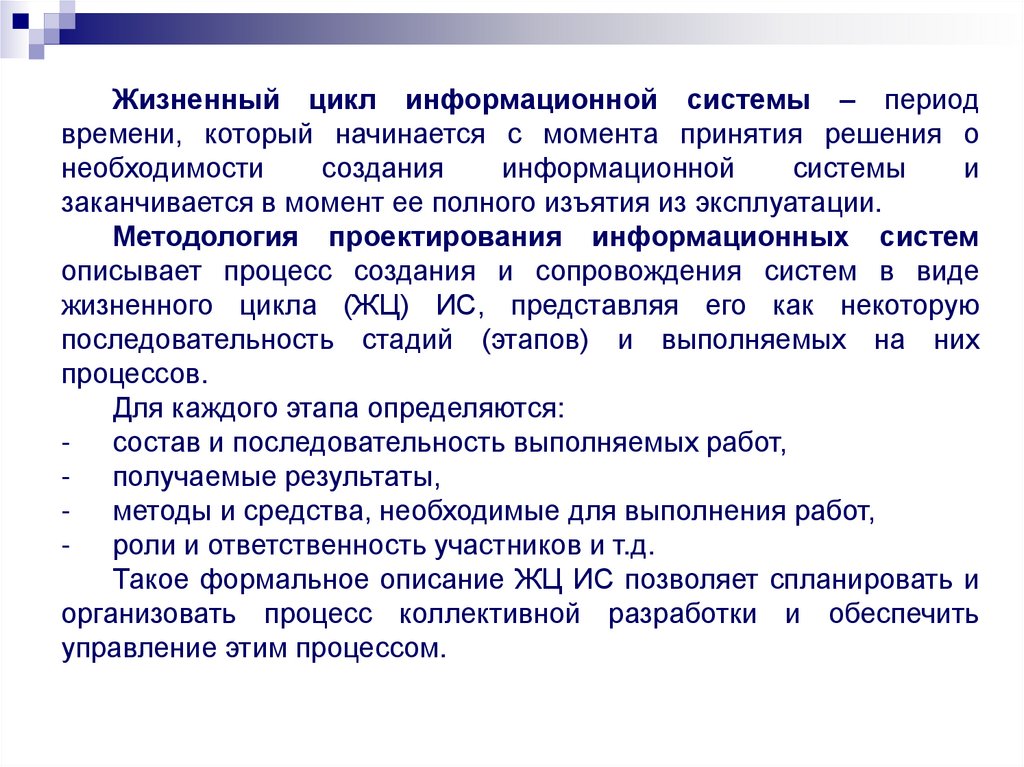 Жизненный цикл информационной системы – периодвремени, который начинается с момента принятия решения о