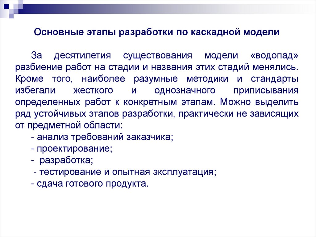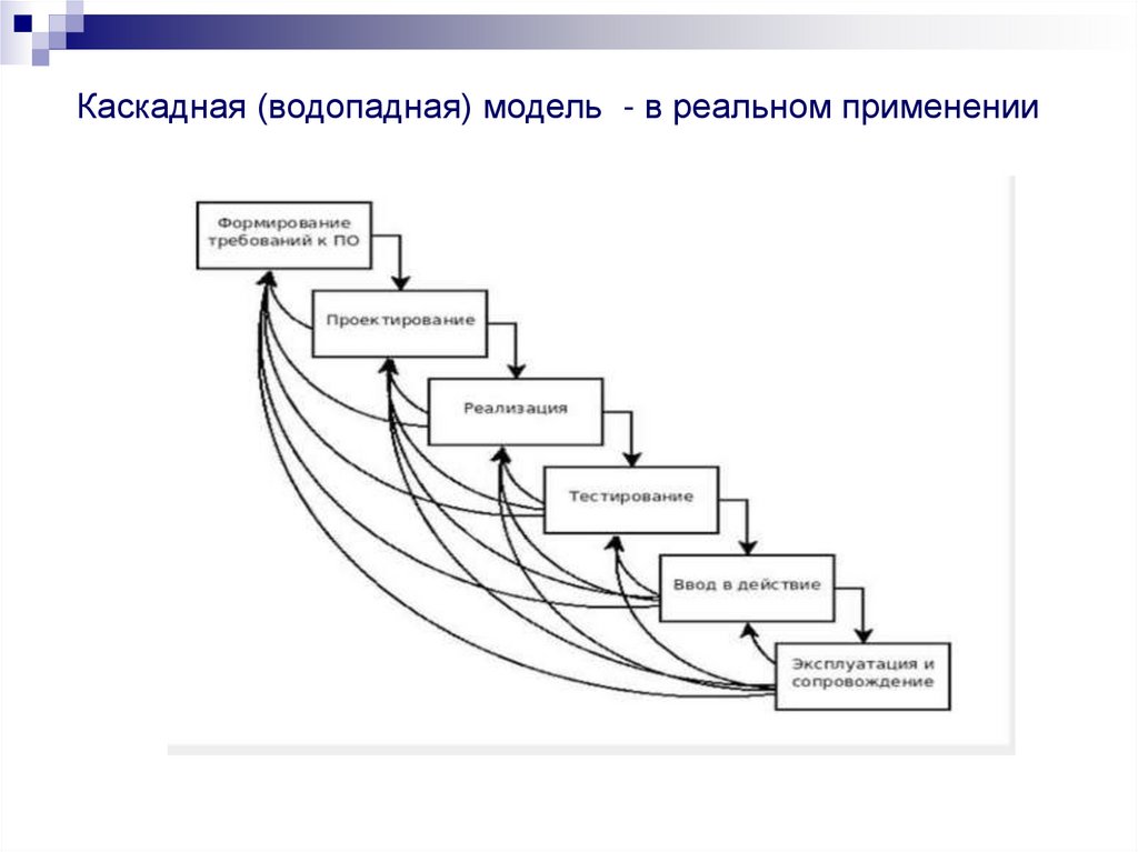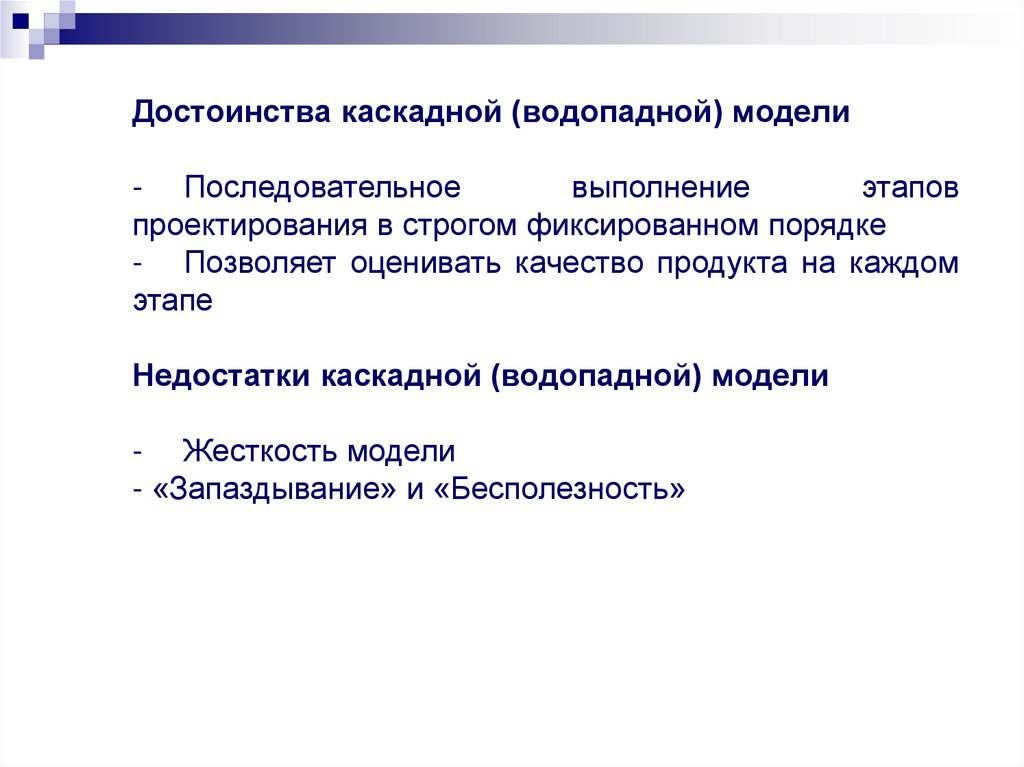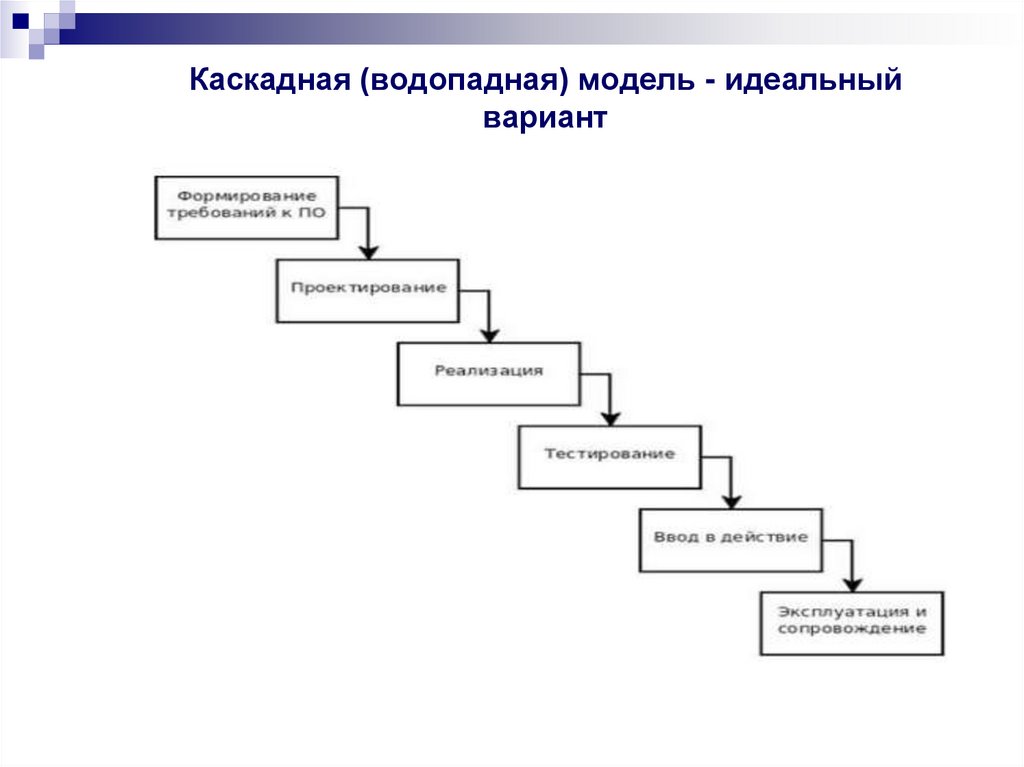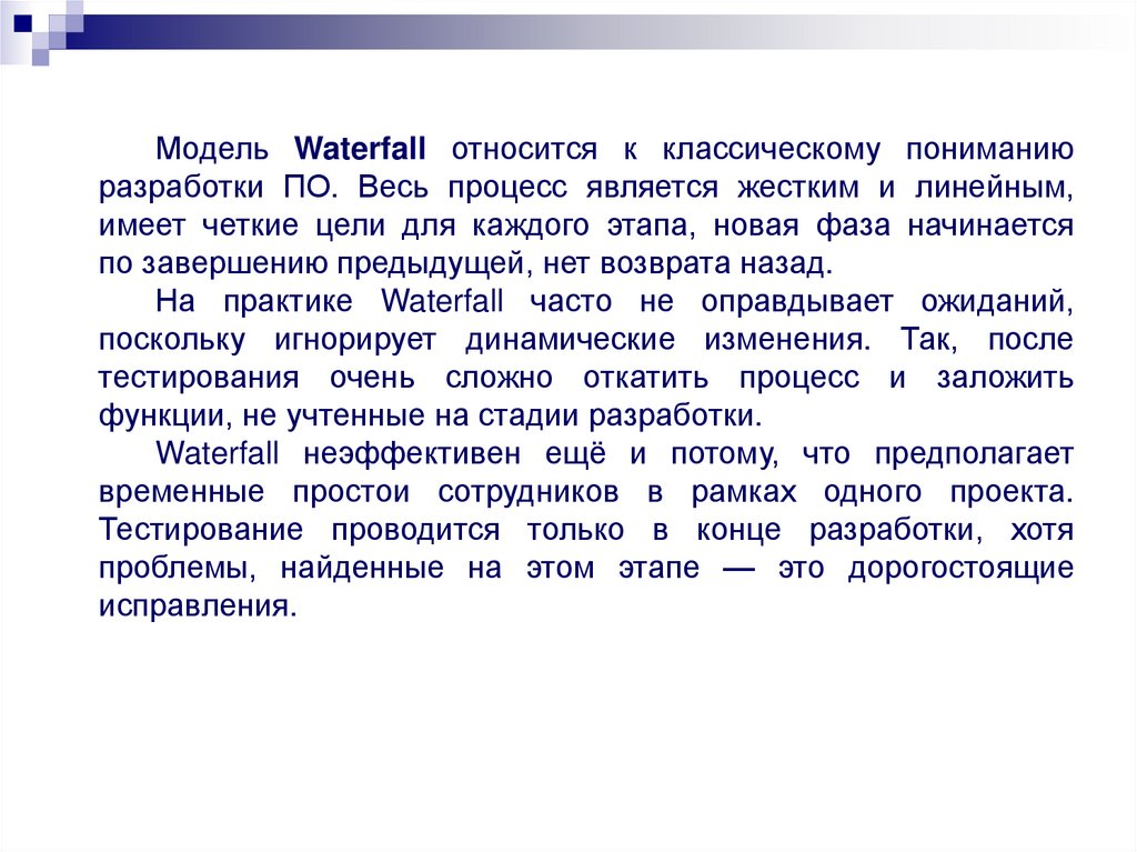 Модель Waterfall относится к классическому пониманиюразработки ПО. Весь процесс является жестким и линейным,