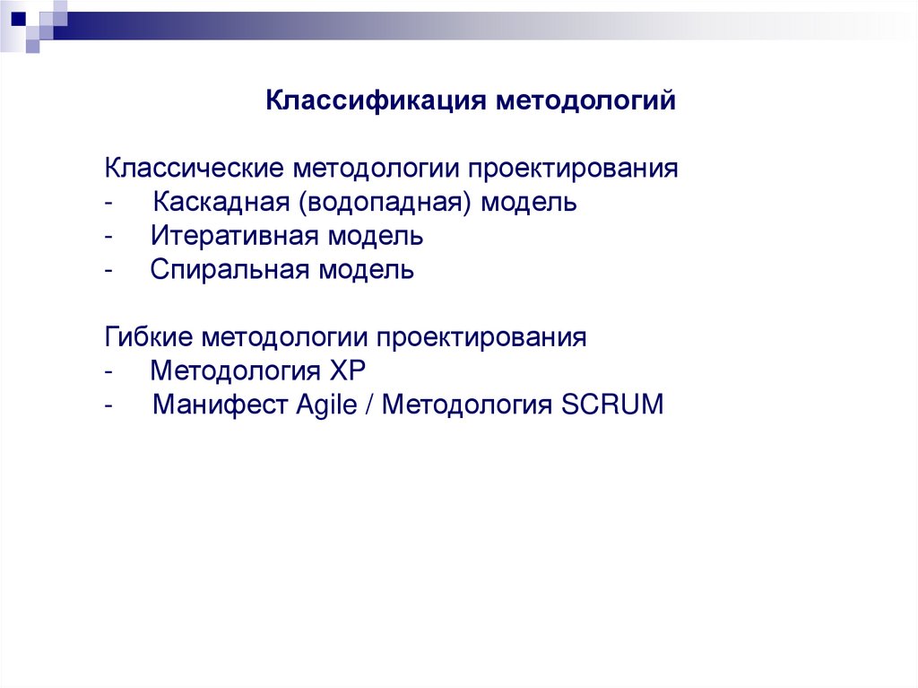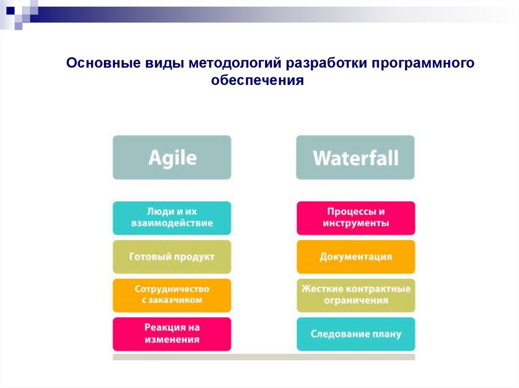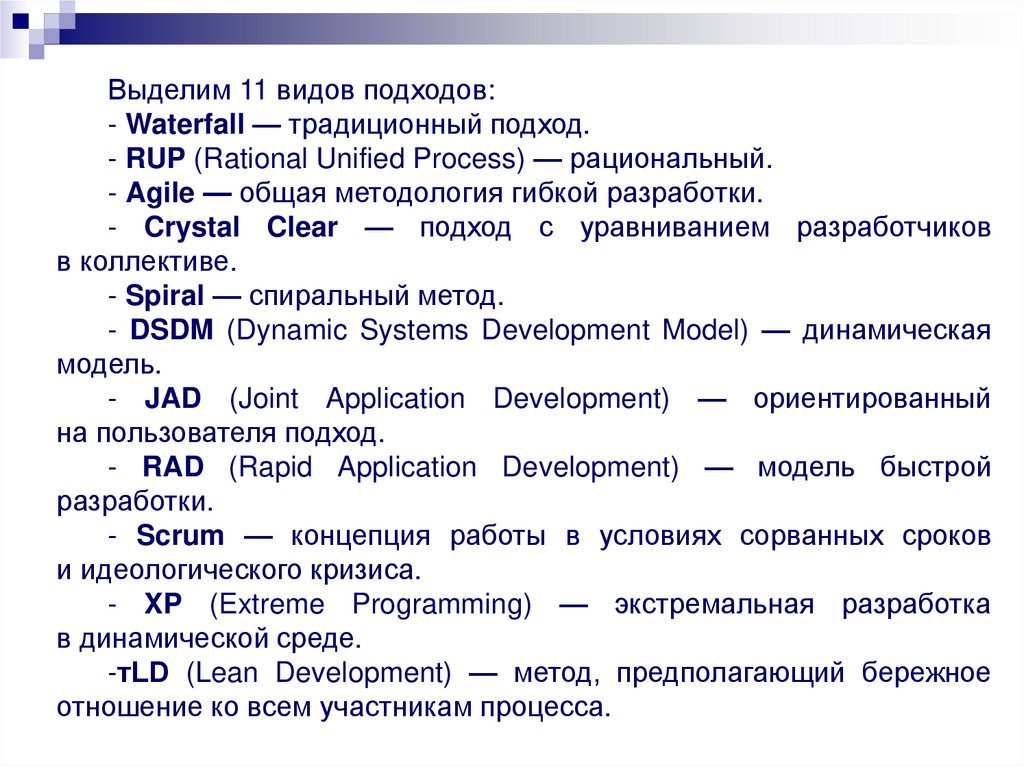 Выделим 11 видов подходов:- Waterfall — традиционный подход.