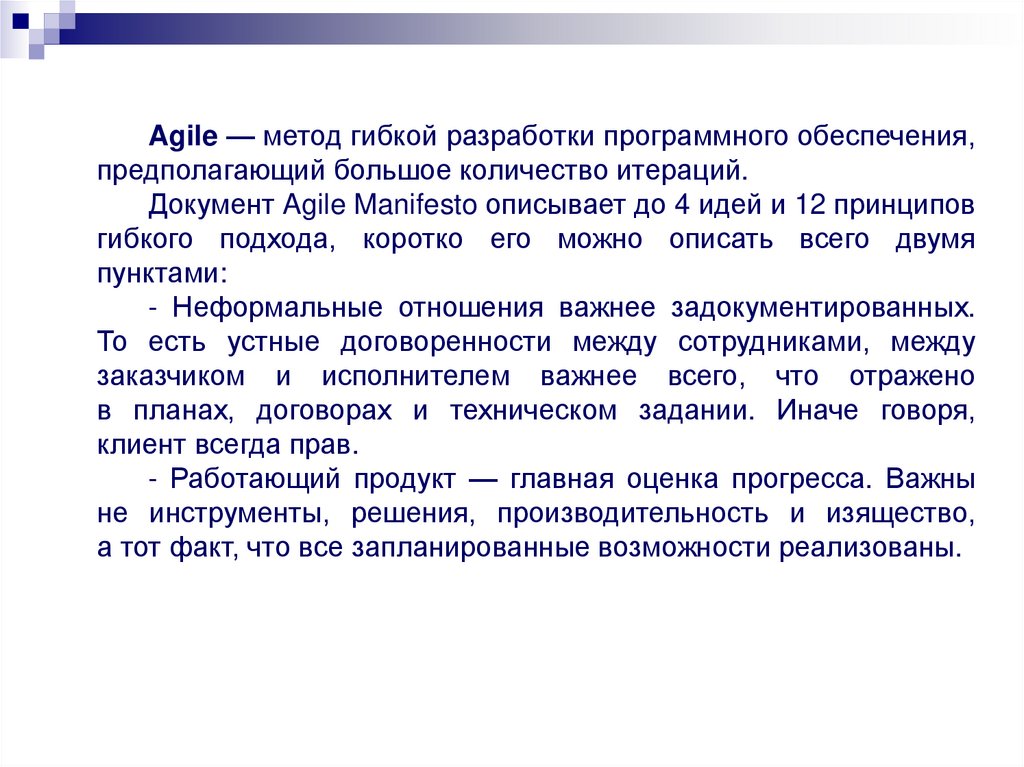 Agile — метод гибкой разработки программного обеспечения,предполагающий большое количество итераций.