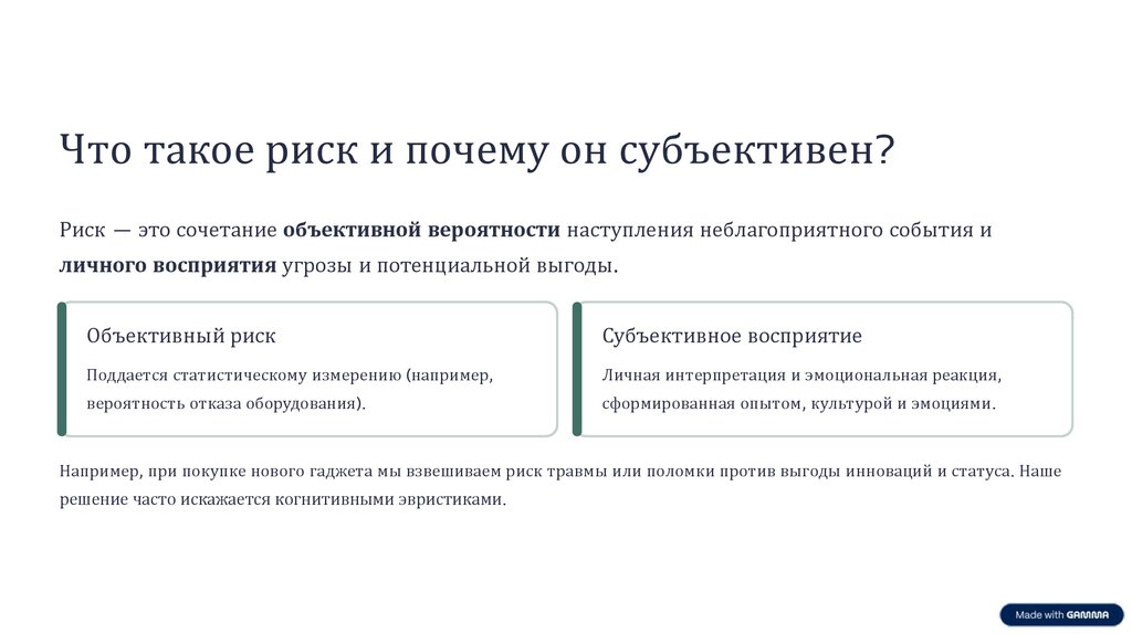 Что такое риск и почему он субъективен?Риск — это сочетание объективной вероятности наступления неблагоприятного события и