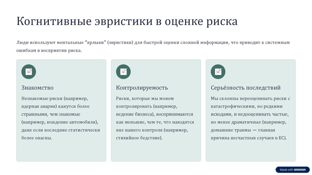 Когнитивные эвристики в оценке рискаЛюди используют ментальные "ярлыки" (эвристики) для быстрой оценки сложной информации, что приводит к системным