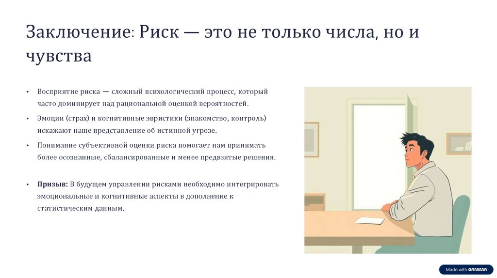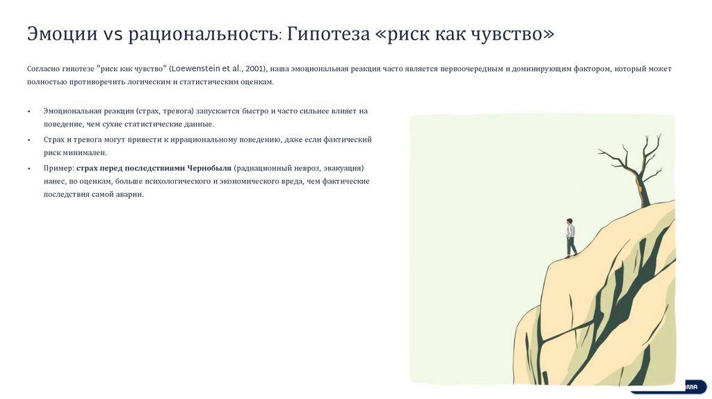 Эмоции vs рациональность: Гипотеза «риск как чувство»Согласно гипотезе "риск как чувство" (Loewenstein et al., 2001), наша эмоциональная реакция часто является первоочередным и доминирующим фактором, который может