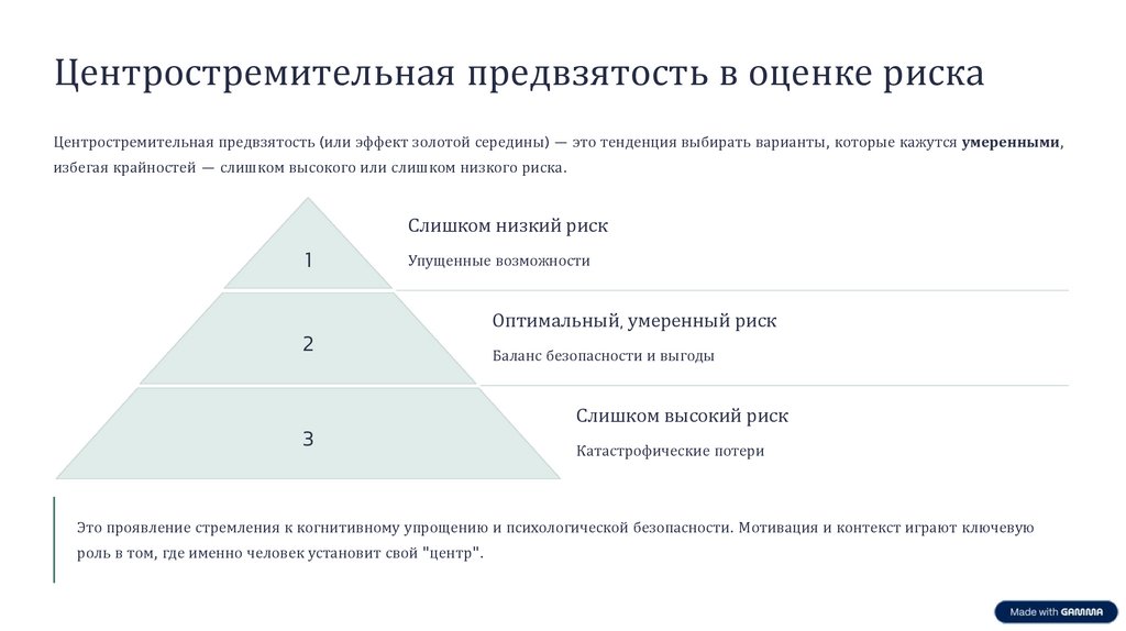 Центростремительная предвзятость в оценке рискаЦентростремительная предвзятость (или эффект золотой середины) — это тенденция выбирать варианты, которые кажутся умеренными,