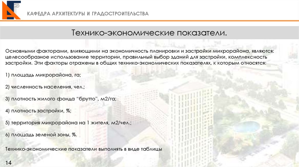 КАФЕДРА АРХИТЕКТУРЫ И ГРАДОСТРОИТЕЛЬСТВАТехнико-экономические показатели.