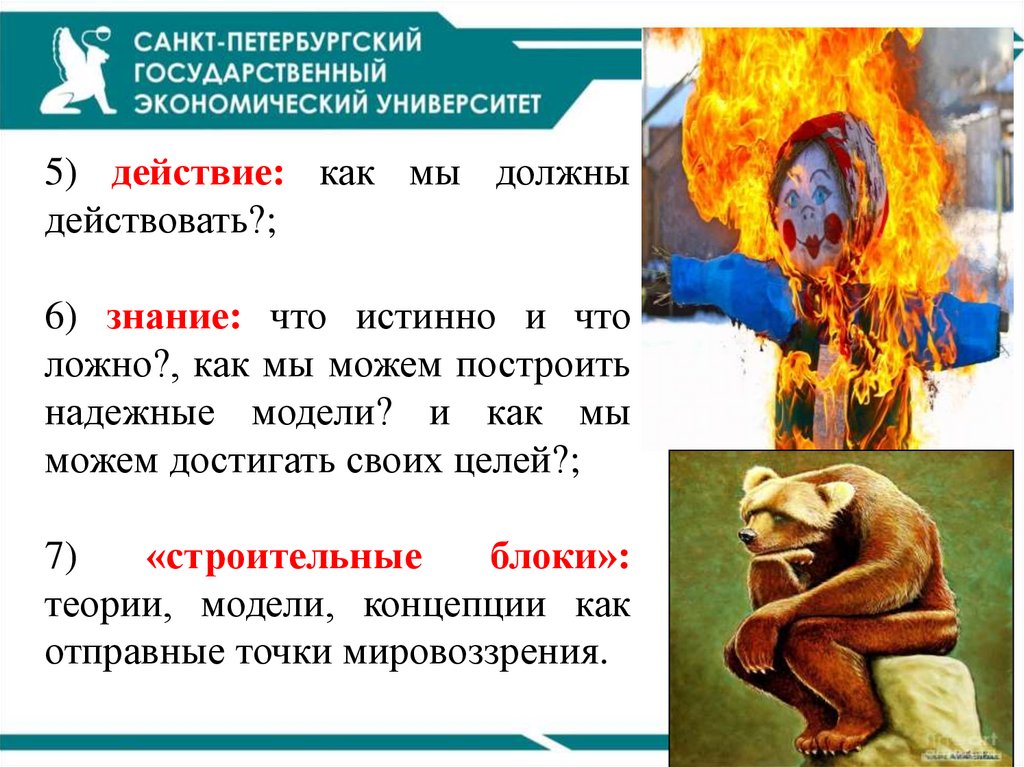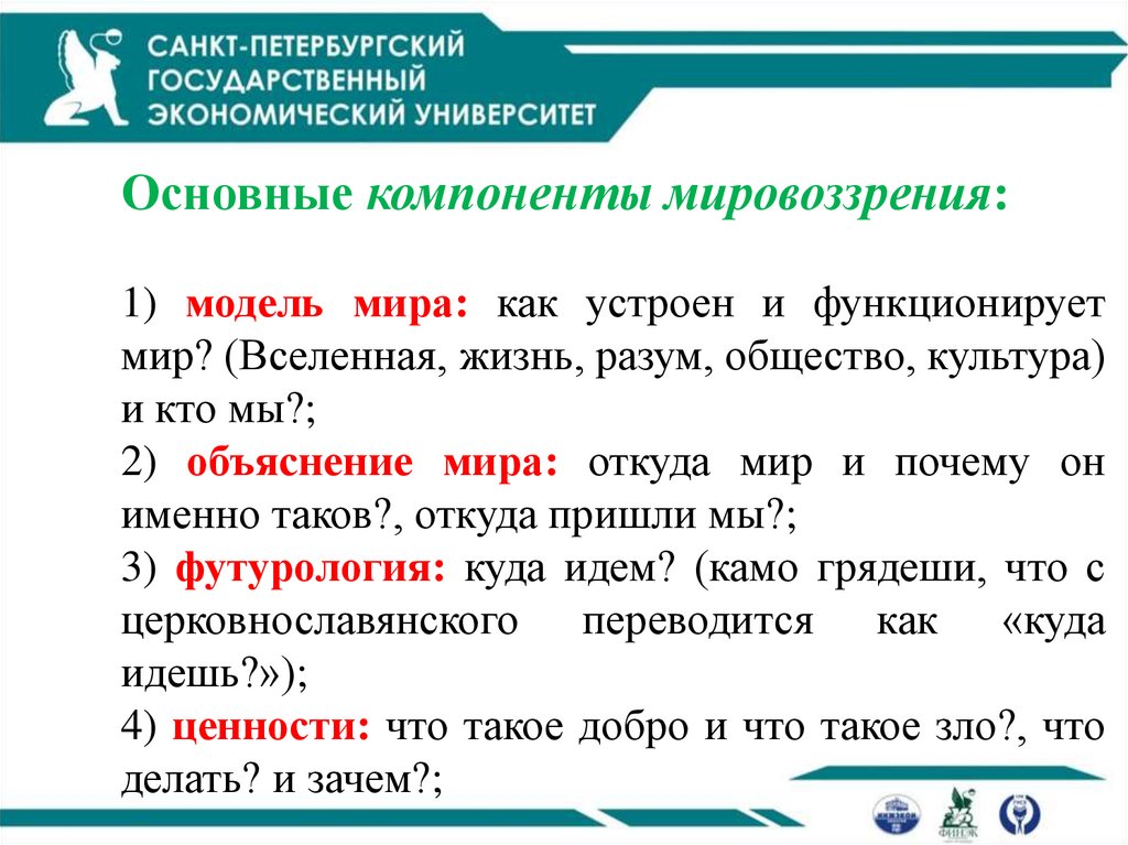 Основные компоненты мировоззрения:1) модель мира: как устроен и функционирует