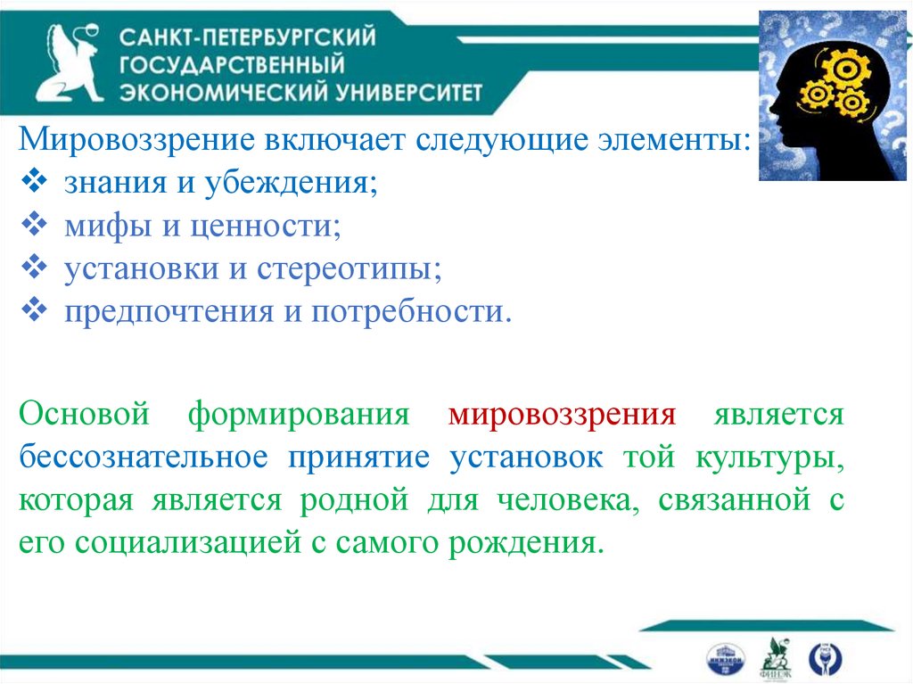 Мировоззрение включает следующие элементы:знания и убеждения;