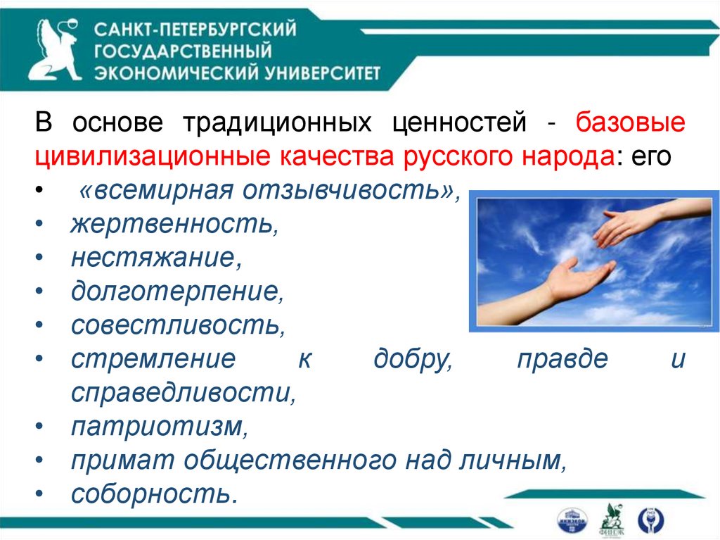 В основе традиционных ценностей - базовыецивилизационные качества русского народа: его