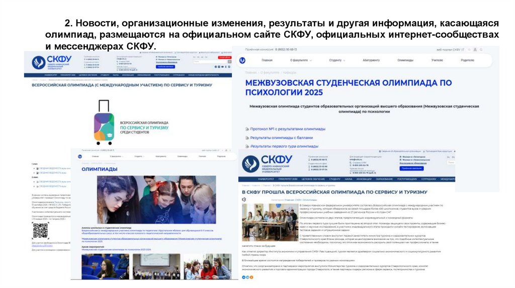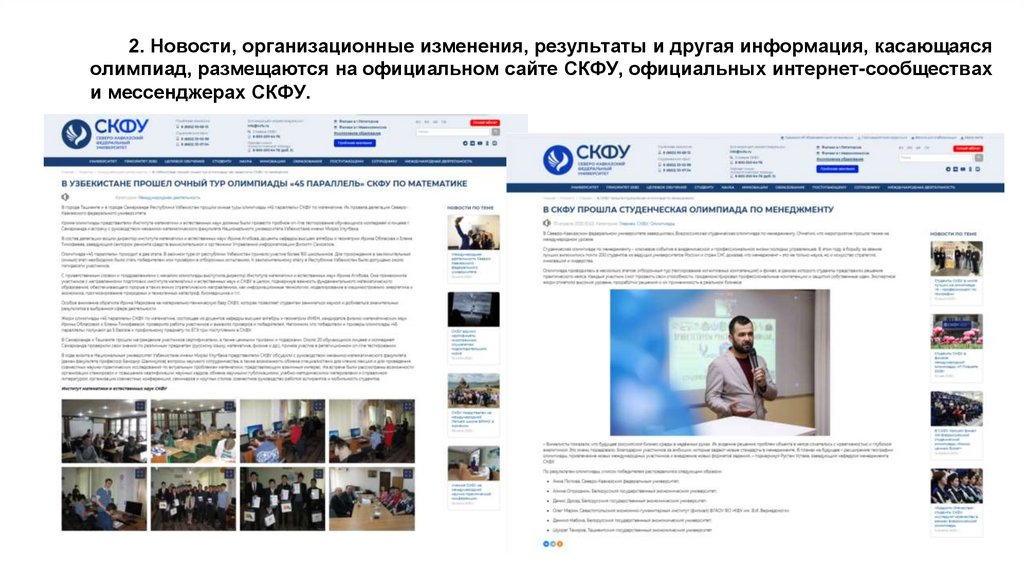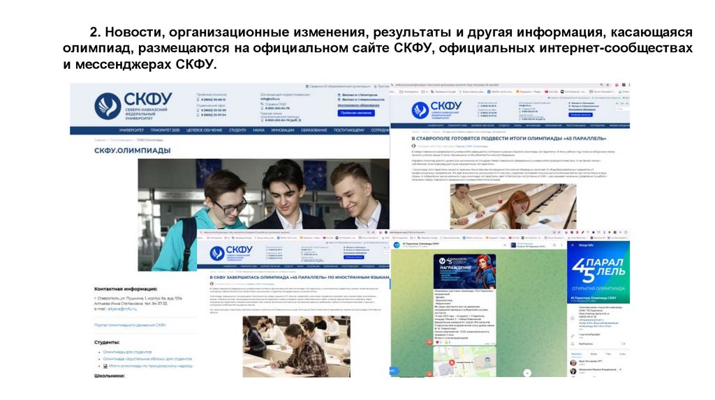 2. Новости, организационные изменения, результаты и другая информация, касающаясяолимпиад, размещаются на официальном сайте СКФУ, официальных интернет-сообществах