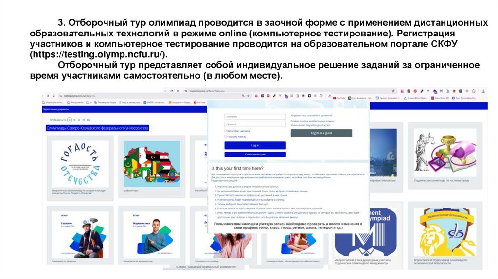 3. Отборочный тур олимпиад проводится в заочной форме с применением дистанционныхобразовательных технологий в режиме online (компьютерное тестирование). Регистрация
