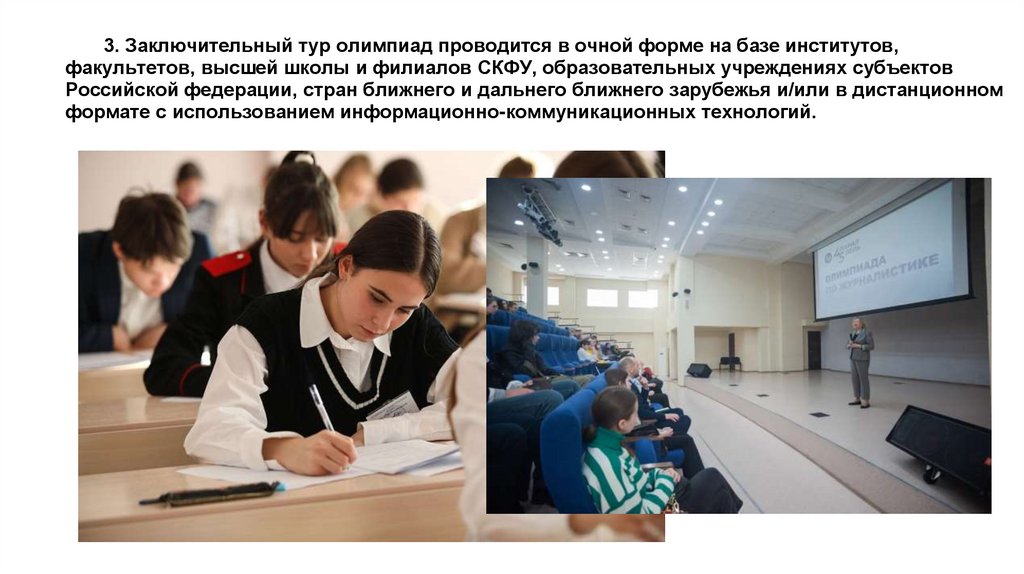 3. Заключительный тур олимпиад проводится в очной форме на базе институтов,факультетов, высшей школы и филиалов СКФУ, образовательных учреждениях субъектов
