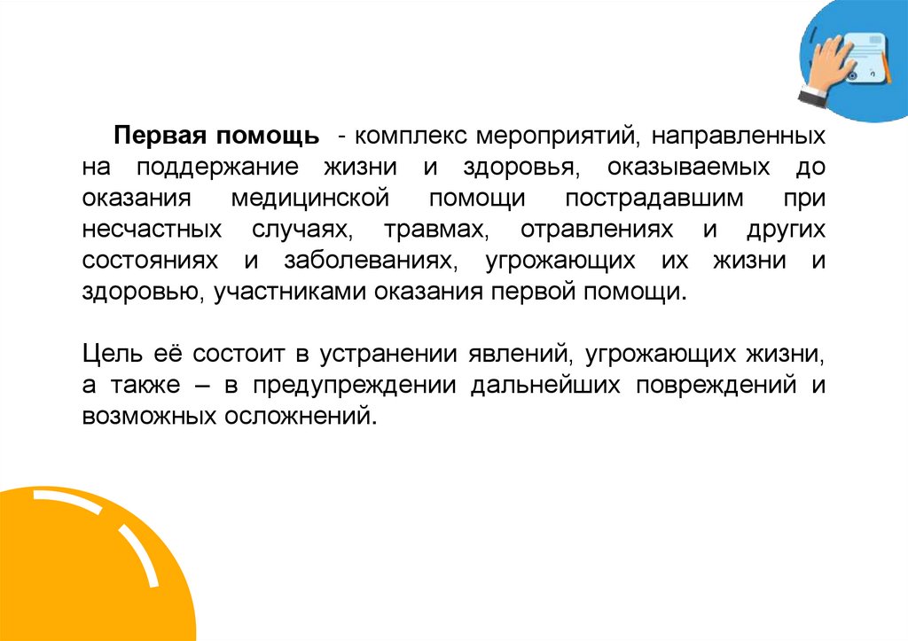 Первая помощь - комплекс мероприятий, направленныхна поддержание жизни и здоровья, оказываемых до