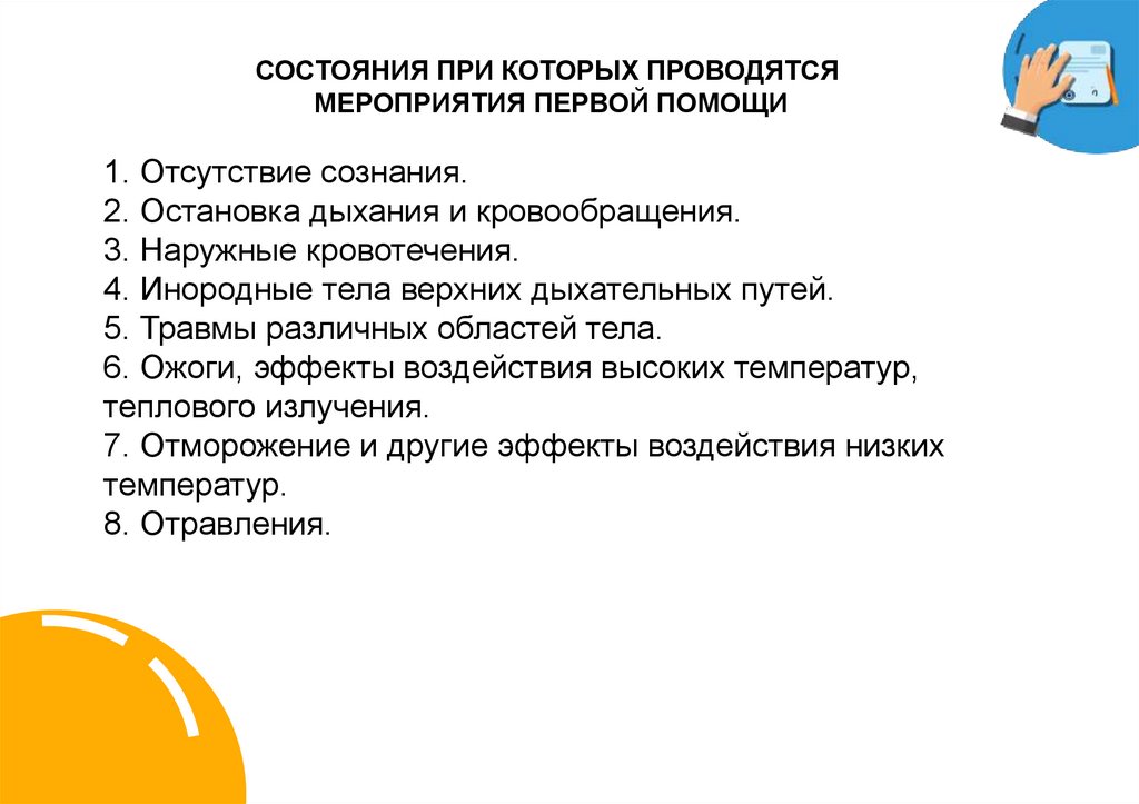 СОСТОЯНИЯ ПРИ КОТОРЫХ ПРОВОДЯТСЯМЕРОПРИЯТИЯ ПЕРВОЙ ПОМОЩИ