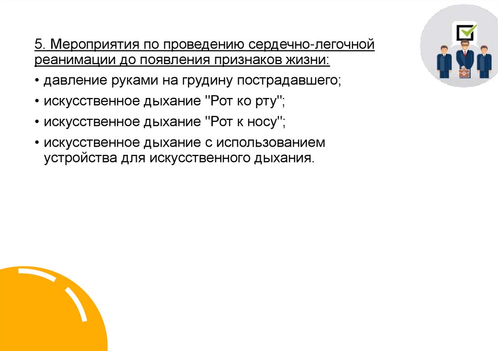5. Мероприятия по проведению сердечно-легочнойреанимации до появления признаков жизни: