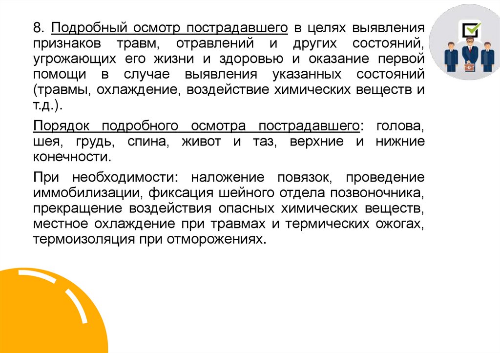 8. Подробный осмотр пострадавшего в целях выявленияпризнаков травм, отравлений и других состояний,