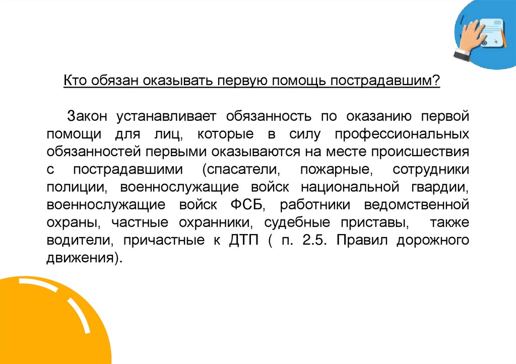 Кто обязан оказывать первую помощь пострадавшим?Закон устанавливает обязанность по оказанию первой