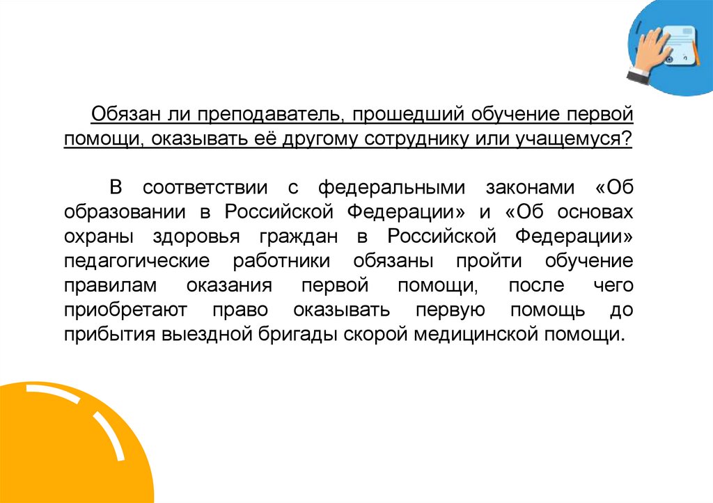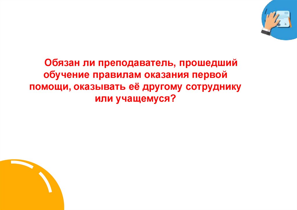 Обязан ли преподаватель, прошедший обучение первойпомощи, оказывать её другому сотруднику или учащемуся?