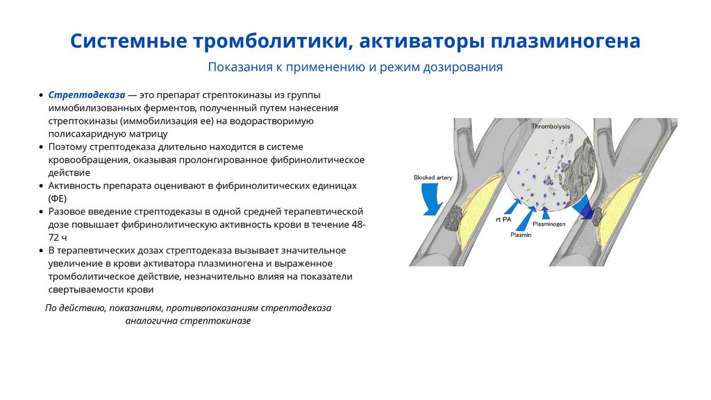 • действует как на «свежий» фибрин, так и на долго существующий, с