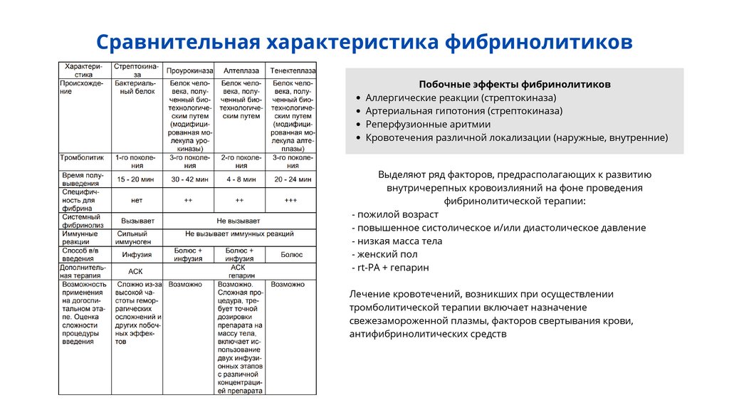 Сравнительная характеристика фибринолитиковПобочные эффекты фибринолитиков