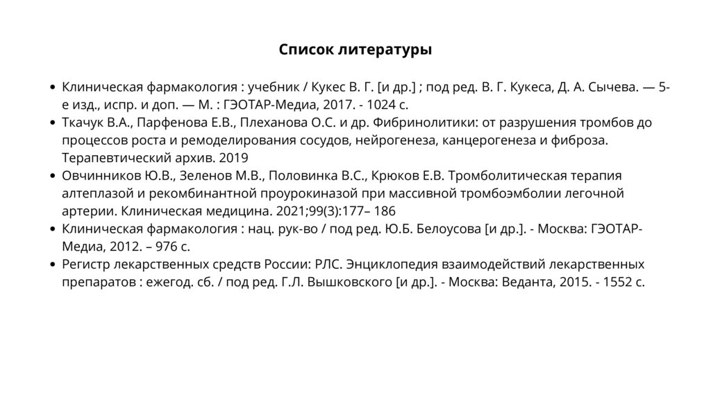 Список литературыКлиническая фармакология : учебник / Кукес В. Г. [и др.] ; под ред. В. Г. Кукеса, Д. А. Сычева. — 5е изд., испр. и доп. — М. : ГЭОТАР-Медиа, 2017. - 1024 с.