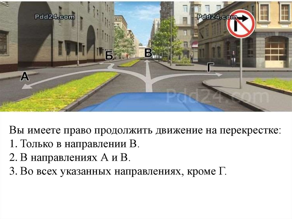 Вы имеете право продолжить движение на перекрестке:1. Только в направлении В.