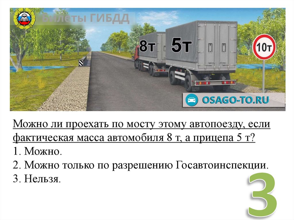 Можно ли проехать по мосту этому автопоезду, еслифактическая масса автомобиля 8 т, а прицепа 5 т?