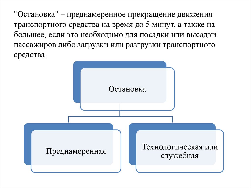 Стоянка — преднамеренное прекращение движения транспортного средствана время более 5 минут по причинам, не связанным с посадкой-высадкой