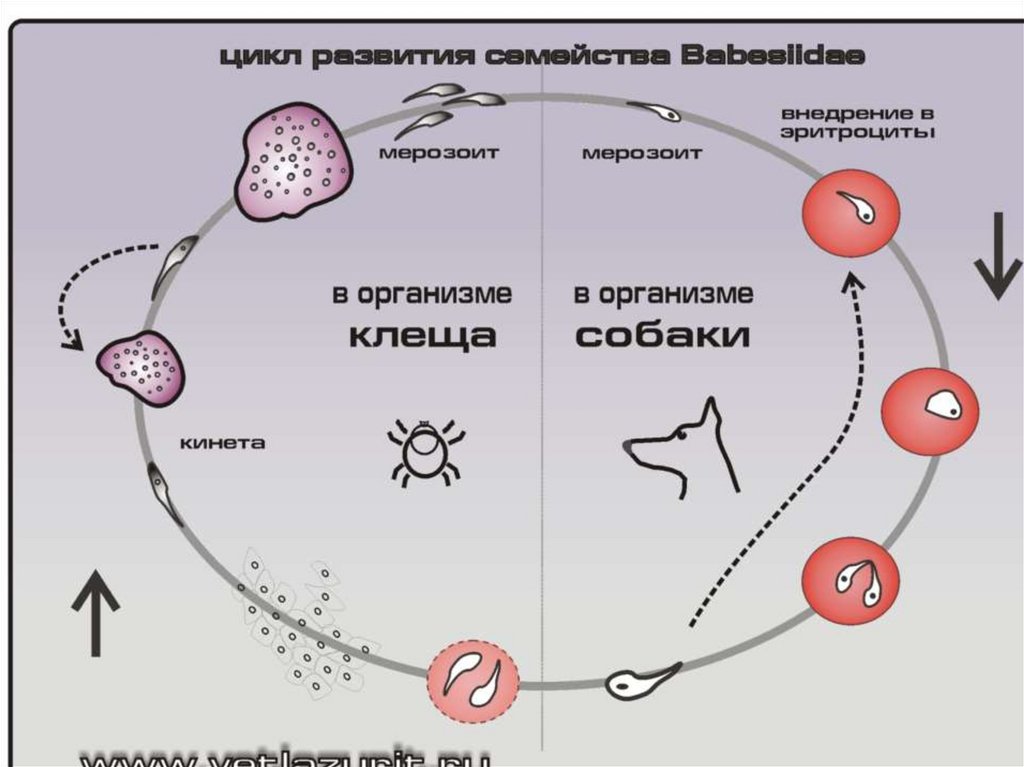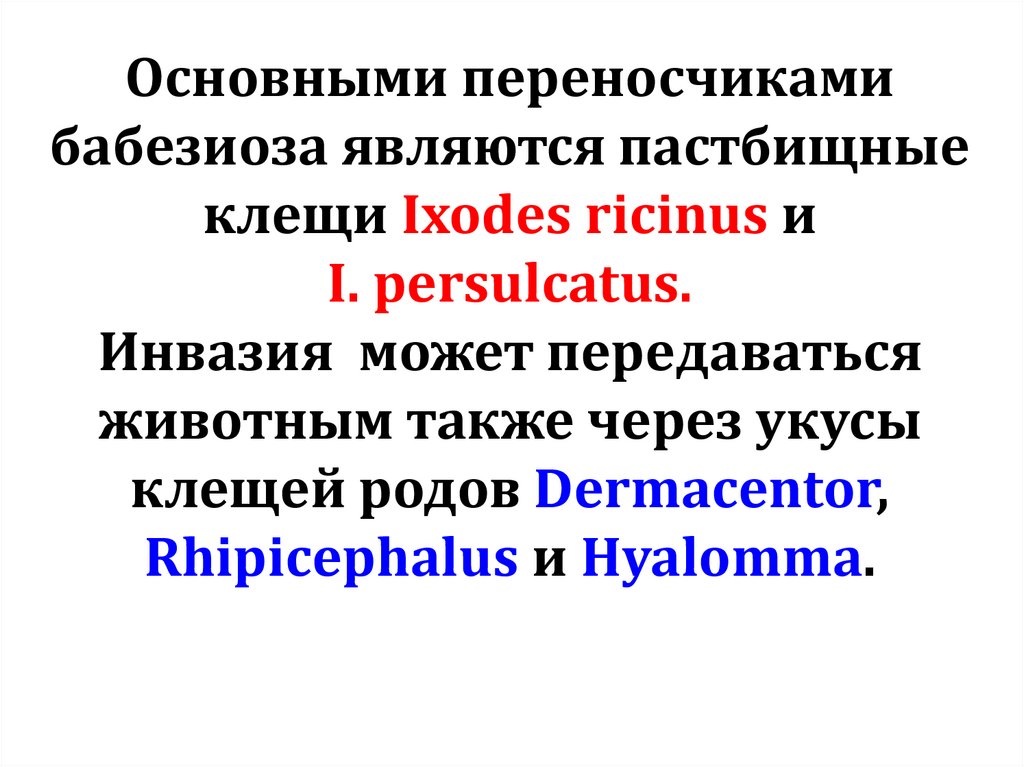 13. В организм клещей – специфических переносчиков, бабезии попадают вместе с кровью в период кровососания. В организме клещей