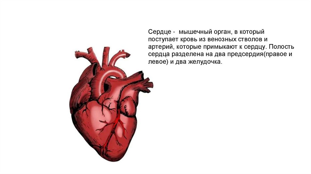 Сердце - мышечный орган, в которыйпоступает кровь из венозных стволов и