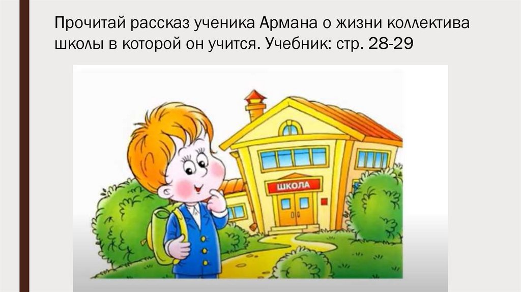 Прочитай рассказ ученика Армана о жизни коллективашколы в которой он учится. Учебник: стр. 28-29