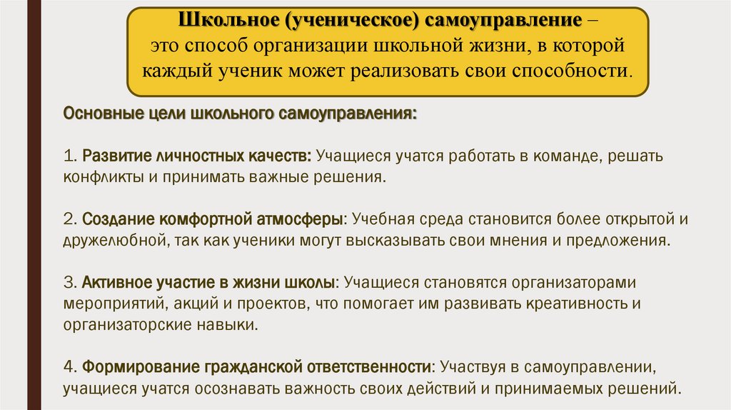 Школьное (ученическое) самоуправление –это способ организации школьной жизни, в которой