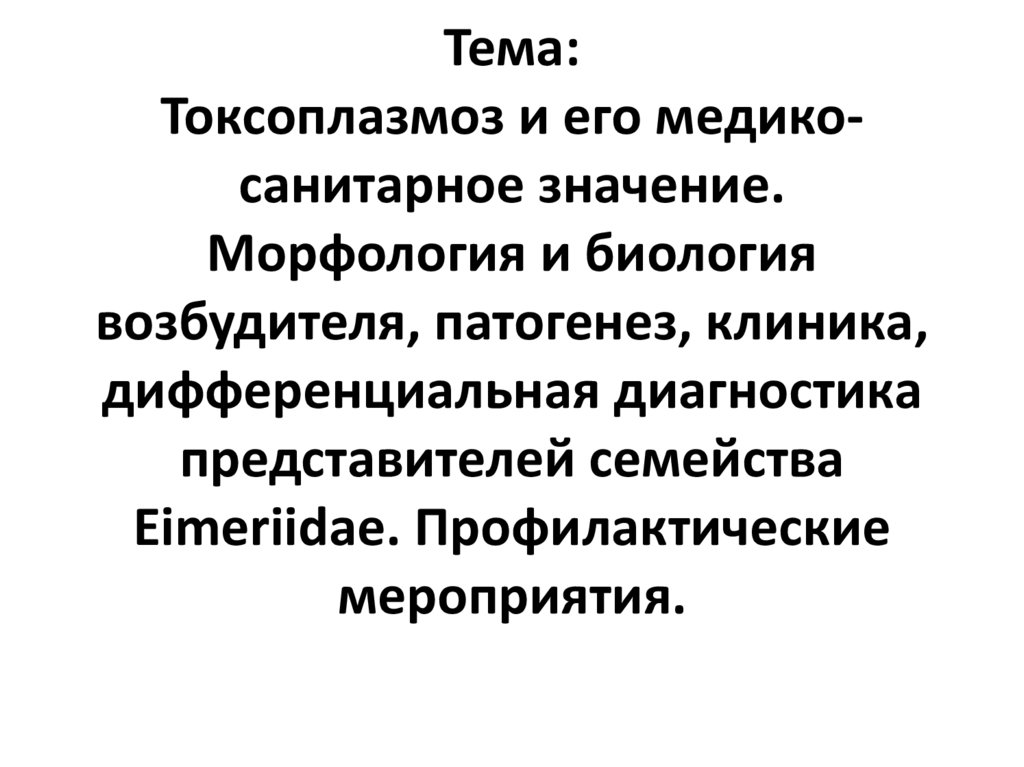 1. Тема: Токсоплазмоз и его медико-санитарное значение. Морфология и биология возбудителя, патогенез, клиника, дифференциальная