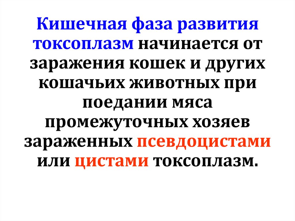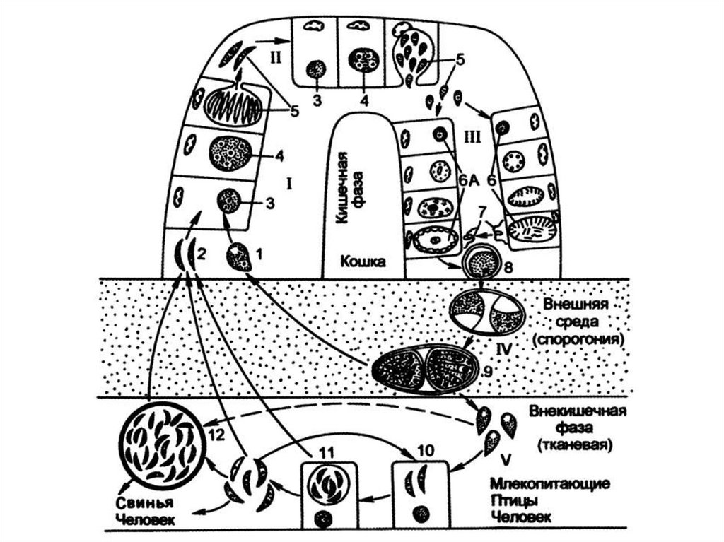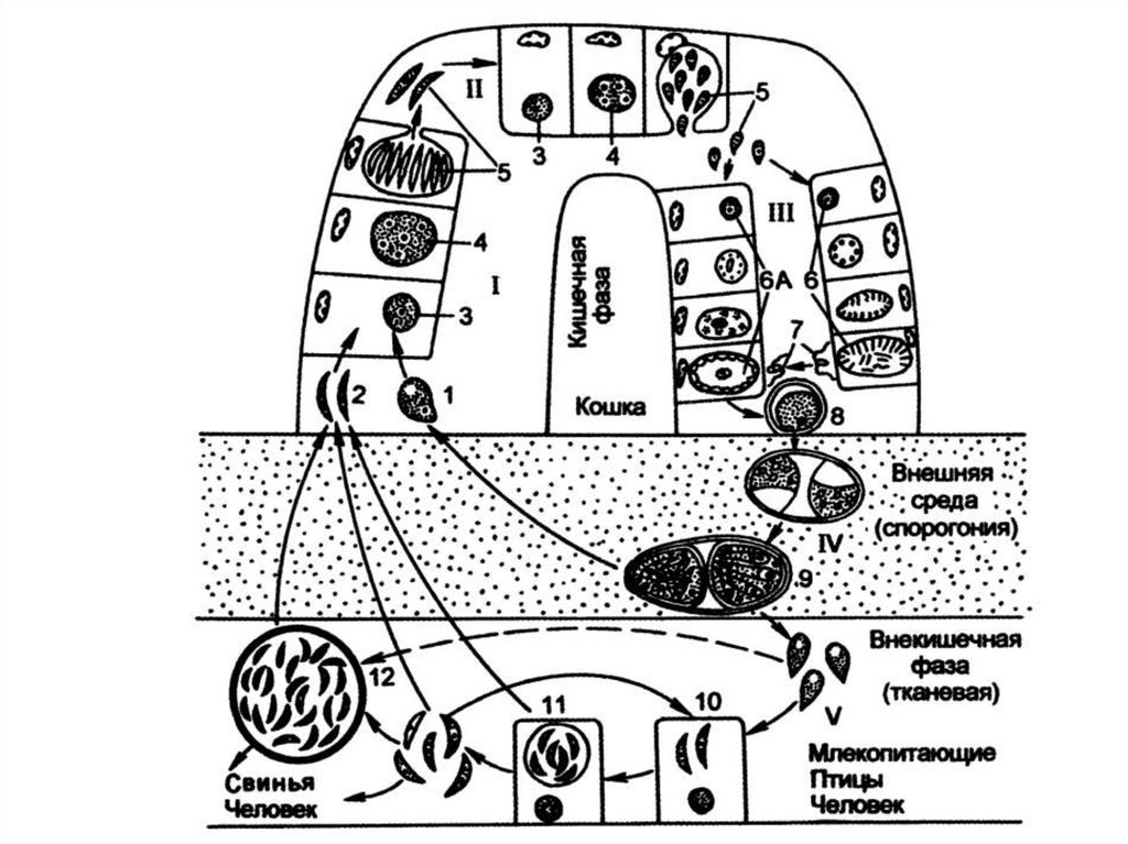 6. Цикл развития. Токсоплазмы проходят две фазы развития: 1. Кишечная фаза развития токсоплазм происходит в организме дефинитивных
