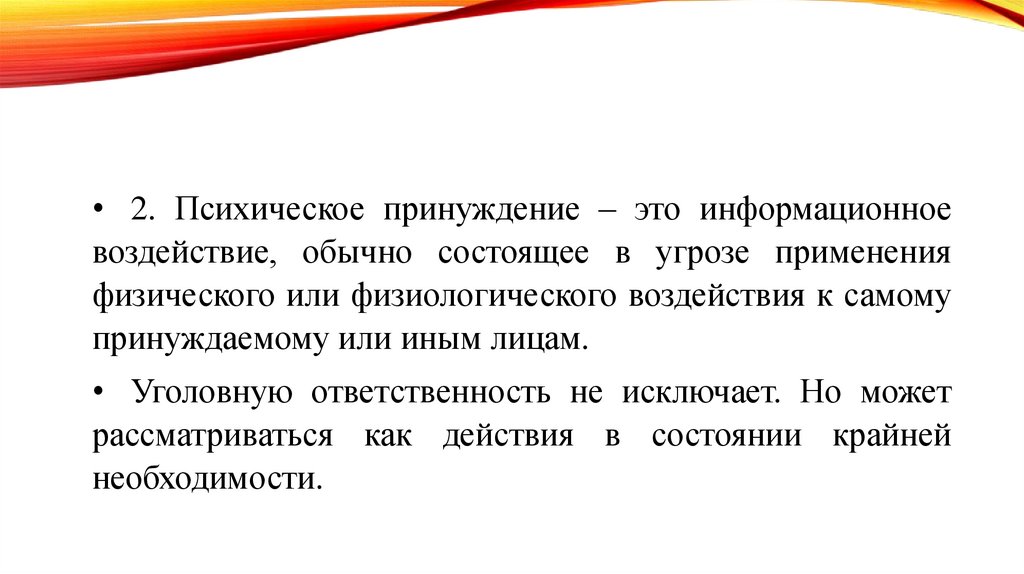 • 2. Психическое принуждение – это информационноевоздействие, обычно состоящее в угрозе применения
