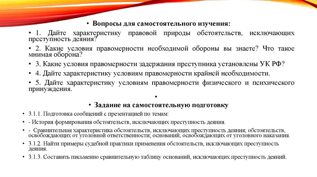 • Вопросы для самостоятельного изучения:• 1. Дайте характеристику правовой природы обстоятельств, исключающих