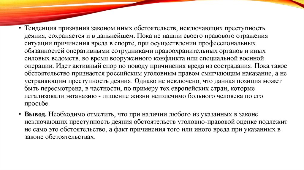 • Тенденция признания законом иных обстоятельств, исключающих преступностьдеяния, сохраняется и в дальнейшем. Пока не нашли своего правового отражения
