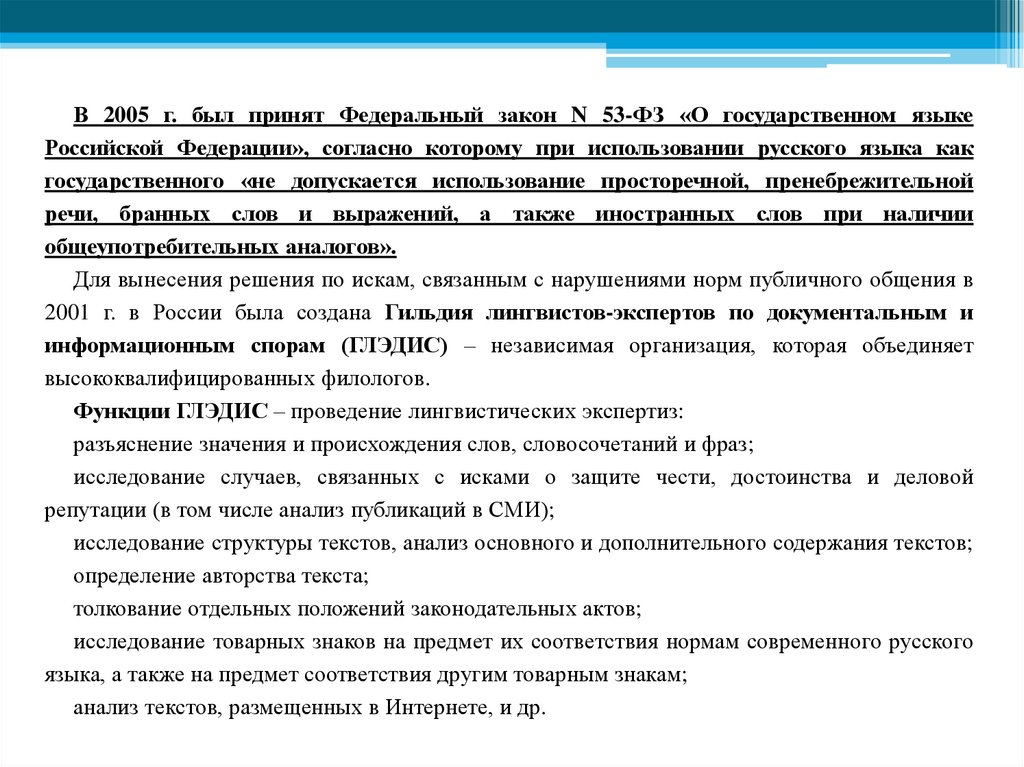 В 2005 г. был принят Федеральный закон N 53-ФЗ «О государственном языкеРоссийской Федерации», согласно которому при использовании русского языка как