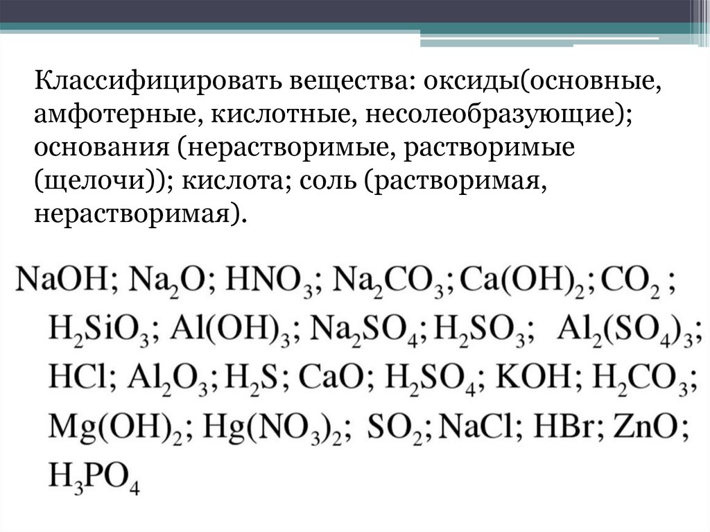 Классифицировать вещества: оксиды(основные,амфотерные, кислотные, несолеобразующие);