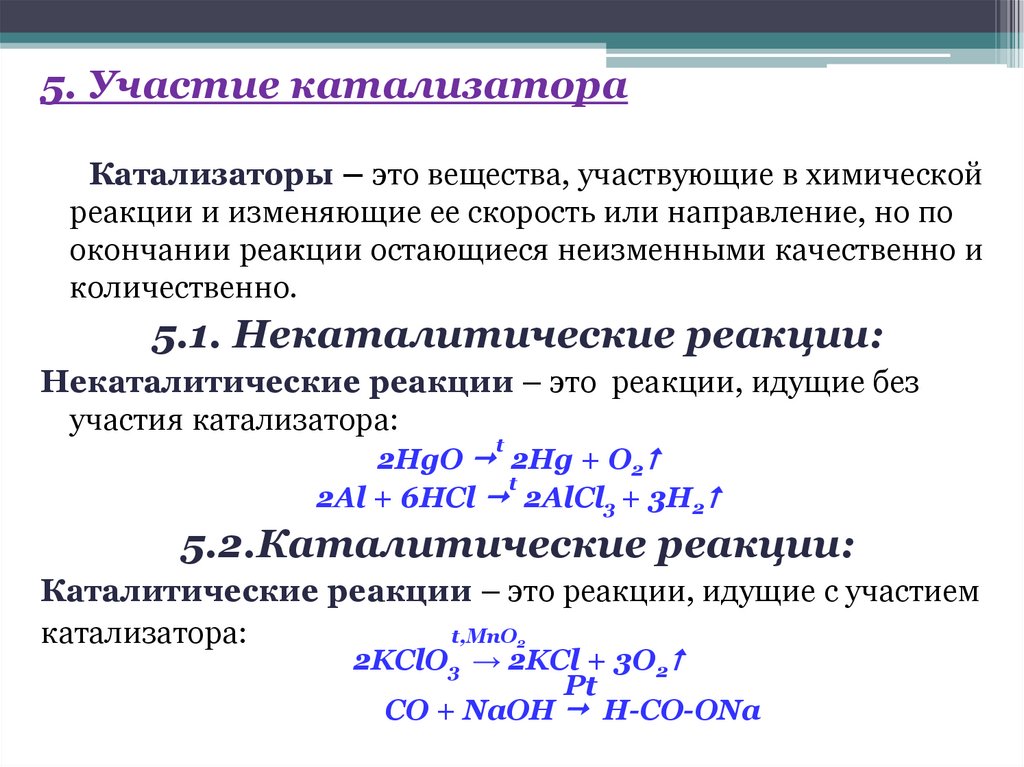 5. Участие катализатораКатализаторы – это вещества, участвующие в химической