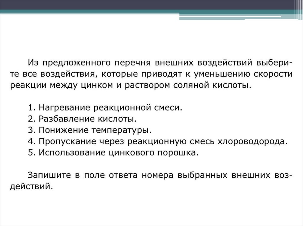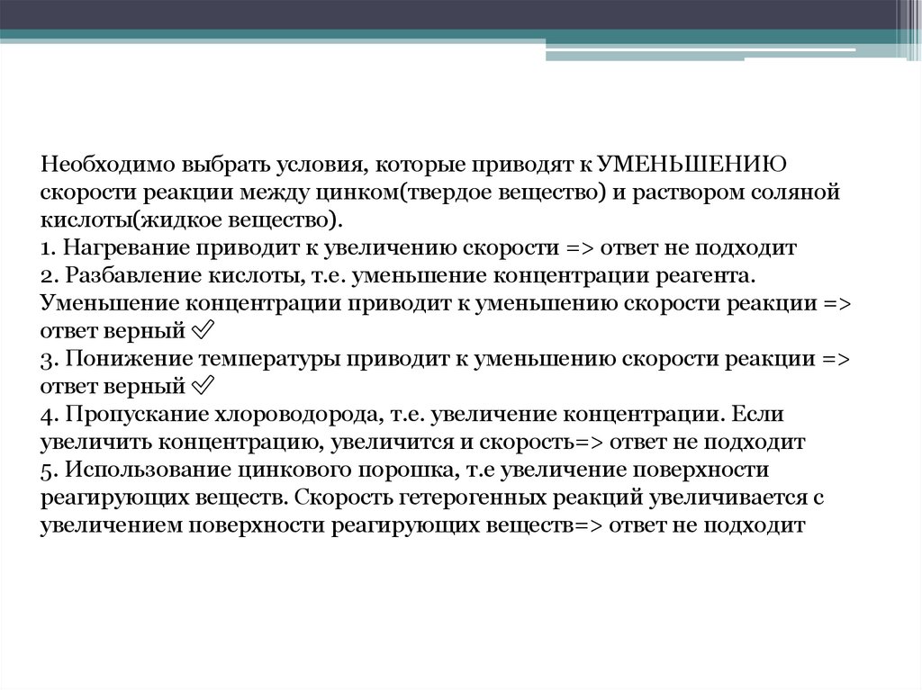 Необходимо выбрать условия, которые приводят к УМЕНЬШЕНИЮскорости реакции между цинком(твердое вещество) и раствором соляной