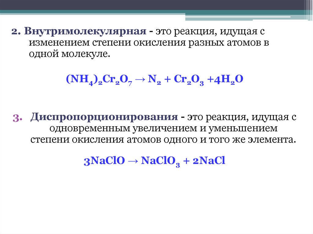 2. Внутримолекулярная - это реакция, идущая сизменением степени окисления разных атомов в
