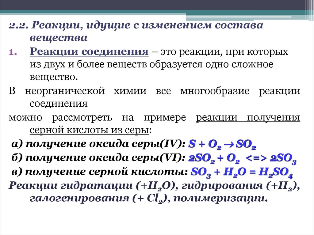 в) получение серной кислоты: SO3 + H2O = H2SO4