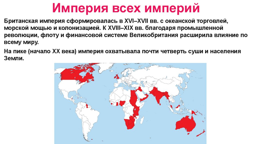 На пике (начало XX века) империя охватывала почти четверть суши и населения