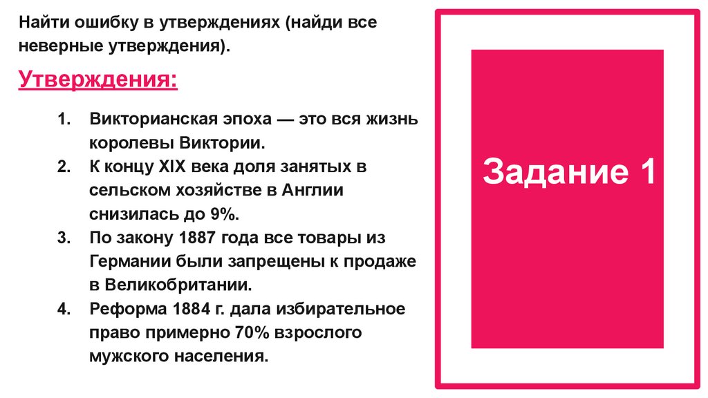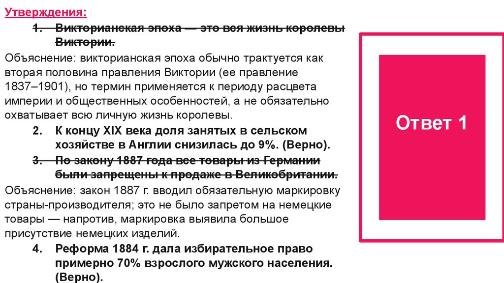 Утверждения:1. Викторианская эпоха — это вся жизнь королевы