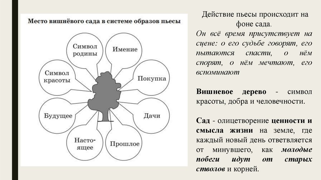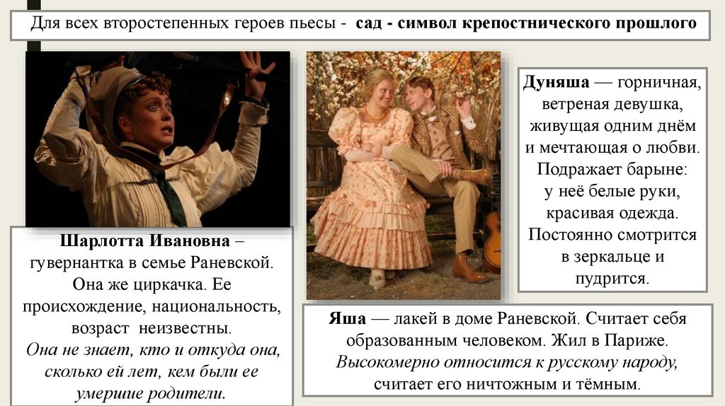 Для всех второстепенных героев пьесы - сад - символ крепостнического прошлогоШарлотта Ивановна –